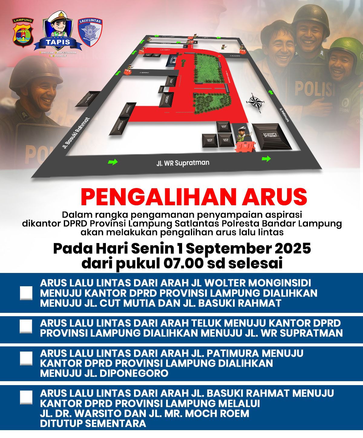 Idnnewspublish.com, Lampung -– Satuan Lalu Lintas (Satlantas) Polresta Bandar Lampung akan memberlakukan pengalihan arus lalu lintas pada Senin (1/9/2025) mulai pukul 07.00 WIB hingga selesai. Langkah ini dilakukan untuk mendukung kelancaran dan keamanan penyampaian aspirasi di Kantor DPRD Provinsi Lampung.