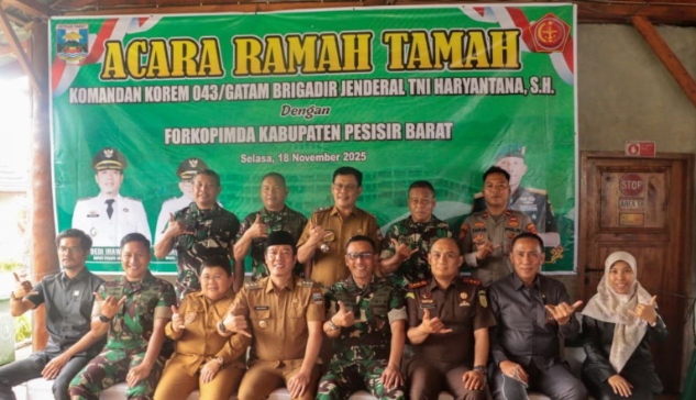 Idnnewspublish.com, Pesisir Barat — Bupati-Wakil Bupati Pesisir Barat (Pesibar), Dedi Irawan – Irawan Topani, S.H., M.Kn., menyambut Kunjungan Kerja (Kunker) Komandan Korem (Danrem) 043/Garuda Hitam (Gatam), Brigjen. TNI. Haryantana, S.H., yang berlangsung di Balai Pekon Negeri Ratu Tenumbang Kecamatan Pesisir Selatan, Selasa (18/11/2025).