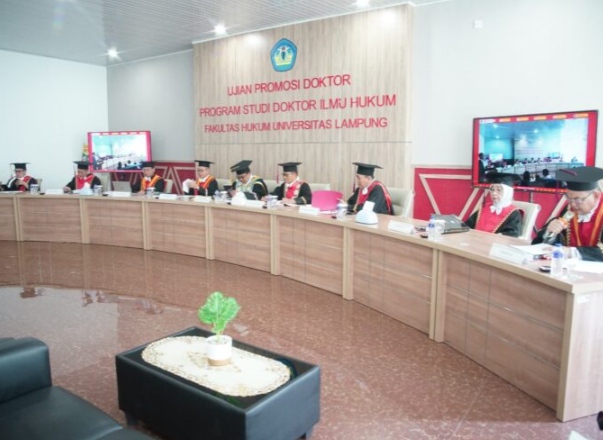 Kegiatan berlangsung di Gedung B lantai dua Program Studi Doktor Ilmu Hukum Unila, dihadiri jajaran pimpinan universitas, penguji, promotor, ko-promotor, serta undangan dari kalangan akademisi dan keluarga.