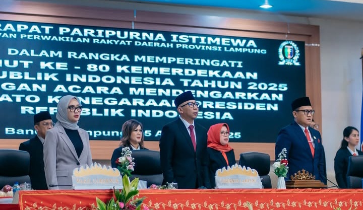 Idnnewspublish.com, Lampung – Ketua DPRD Lampung, Ahmad Giri Akbar bersama Wakil Gubernur Jihan Nurlela, Forkopimda, pimpinan dan anggota DPRD, serta jajaran Pemprov Lampung menghadiri Rapat Paripurna lstimewa DPRD Provinsi Lampung dalam rangka mendengarkan Pidato Kenegaraan Presiden RI, Prabowo Subianto pada HUT RI ke-80, Jumat (15/08/225) di Ruang Sidang DPRD Lampung.