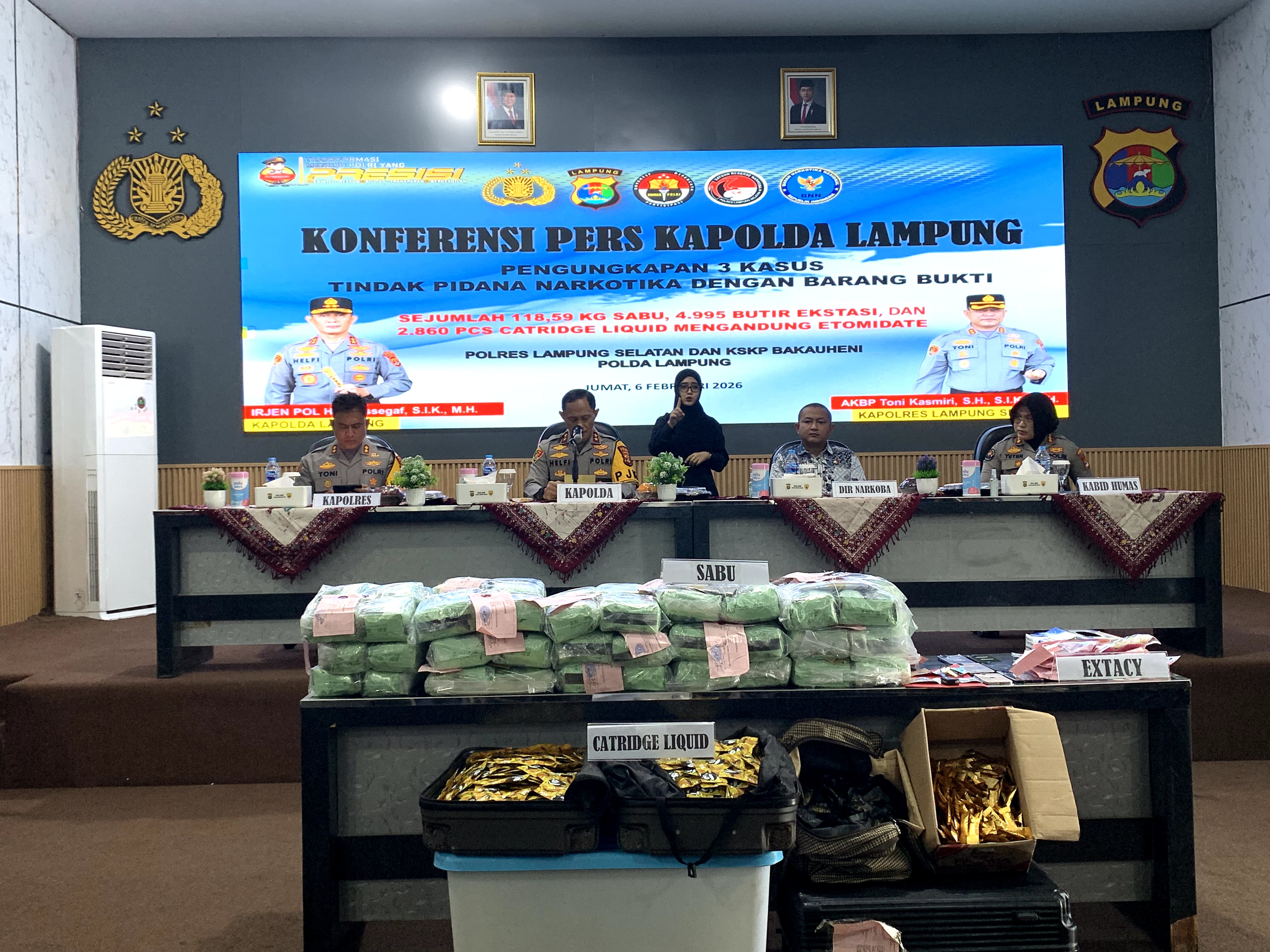 Polda Lampung Ungkap Peredaran Narkoba Jaringan Antar Provinsi, Sita Sabu 118,6 Kg dan Ribuan Ekstasi